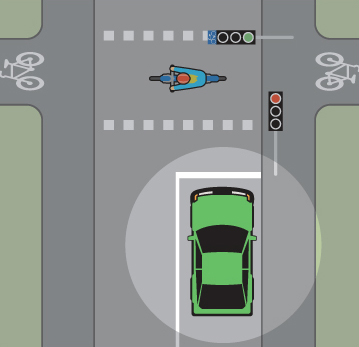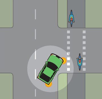- När du har svängt i en korsning och ska passera en obevakad cykelöverfart, ska du köra med låg hastighet och ge cyklande och mopedister (klass II), som är ute på eller just ska ut på cykelöverfarten, tillfälle att passera.