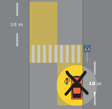 - Du får inte köra om strax före eller på ett obevakat övergångsställe. - Du får inte stanna eller parkera på ett övergångsställe eller närmare än 10 meter före ett övergångs- ställe. Det gäller både bevakade och obevakade övergångsställen.
